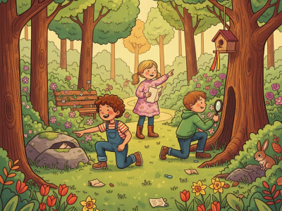 Es werden draußen verschiedenen Hinweisen hinterhergejagt um einen Schatz zu finden.